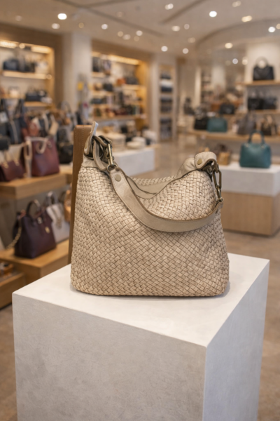 Diese hochwertige Damen-Schultertasche aus handschuhweichem Vollrindleder ist lässig sportlich. Das geflochtene Leder (Waschleder) im Vintage Design und in der Farbe sandfarben/beige macht die Tasche zu einem stilvollen Begleiter für Alltag und besondere Anlässe. Sie bietet großzügigen Stauraum und kann flexibel als Umhängetasche (crossover) oder über der Schulter getragen werden.