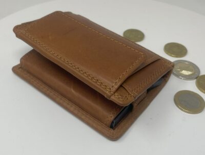 Gefertigt in bewährter HILL-BURRY Qualität überzeugt das Etui durch ein robustes Design mit integriertem RFID-Schutz, einem cleveren Kartenmechanismus im Metallgehäuse sowie einem separaten Münzfach mit Druckknopfverschluss.