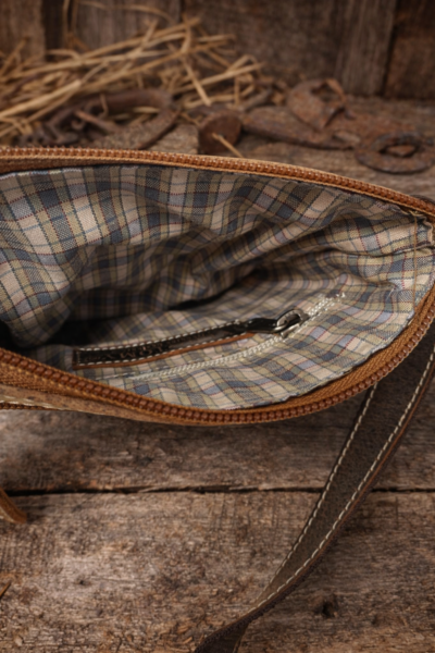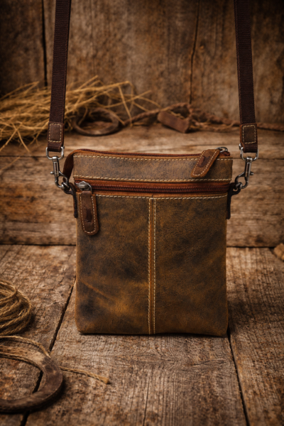 Rustikale kleine alltagstaugliche braune Tasche aus Vollrindleder (Hunter ) mit langem verstellbarem Gurt, textilunterfüttert.