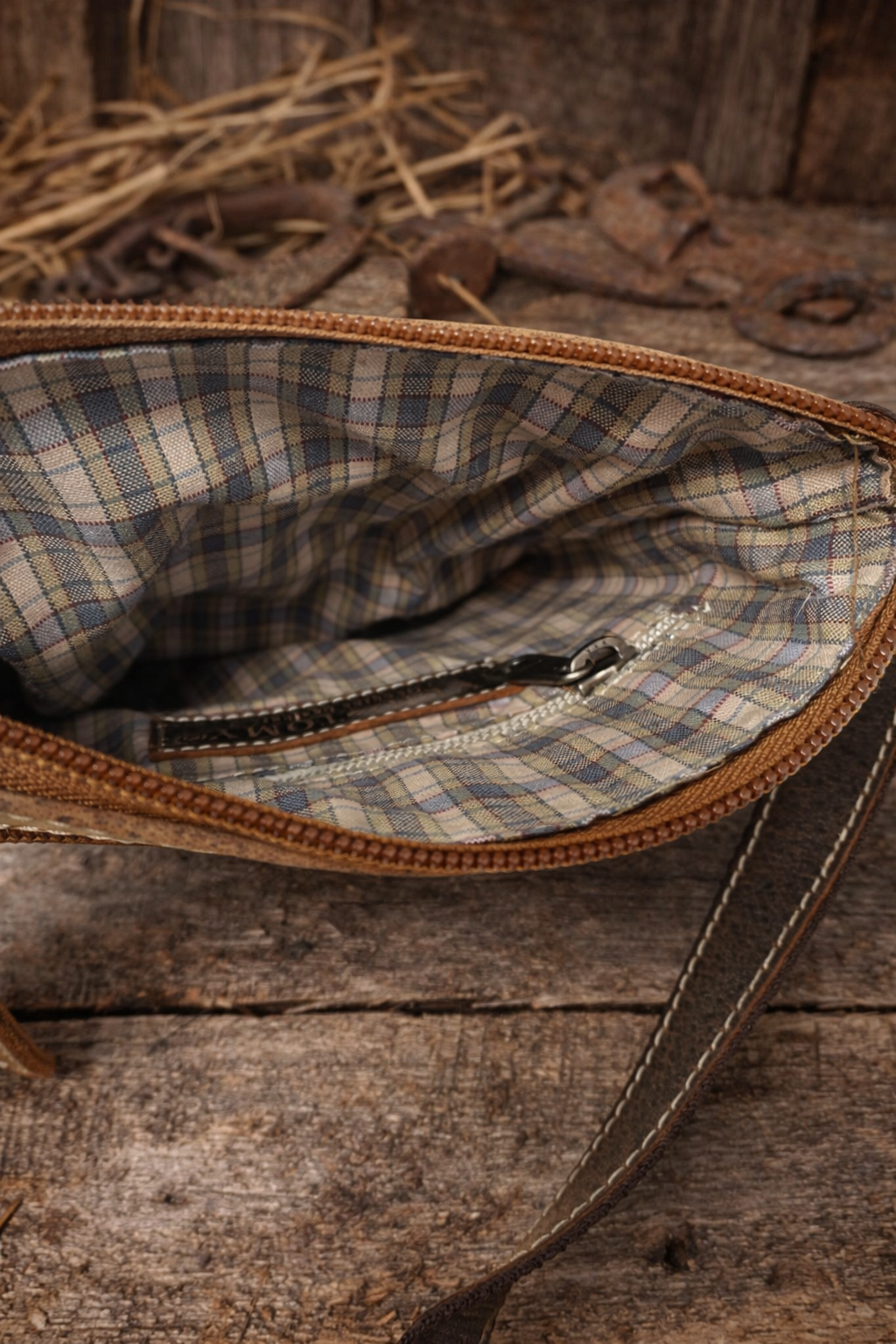 Innen: 1 gefüttertes Fach im Karo-Design, 1 Reißverschlussfach