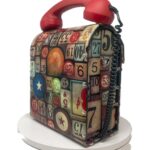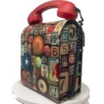 Telefontasche mit bunten Zahlen, langem Schultergurt und Hörer als Tragegriff