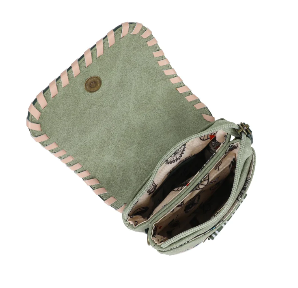 Bedrucktes und geprägtes veganes Leder, handgenähte Applikationen und antikgoldfarbene Elemente verleihen ihr eine ganz besondere Ausstrahlung.