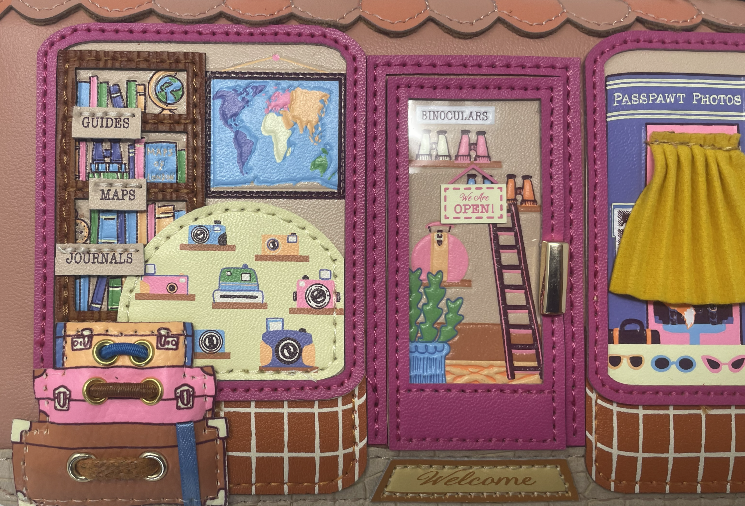 Bedrucktes und geprägtes veganes Leder, handgenähte Applikationen und antikgoldfarbene Elemente verleihen ihr eine ganz besondere Ausstrahlung.